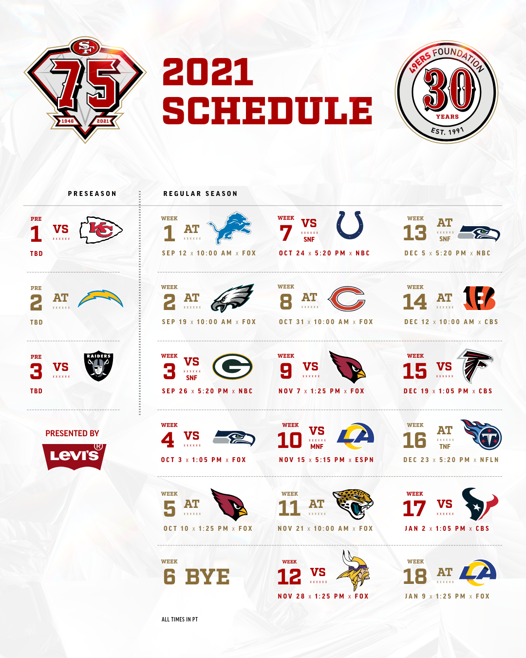 The final two games for years after 2021 will be against the teams in the listed division with the specific teams to be determined by final record. Partner of usa today sports digital properties. The 49ers just announced their full schedule for 2021. Visit espn to view the san francisco 49ers team schedule for the current and previous seasons. San francisco 49ers announce 2021 schedule.