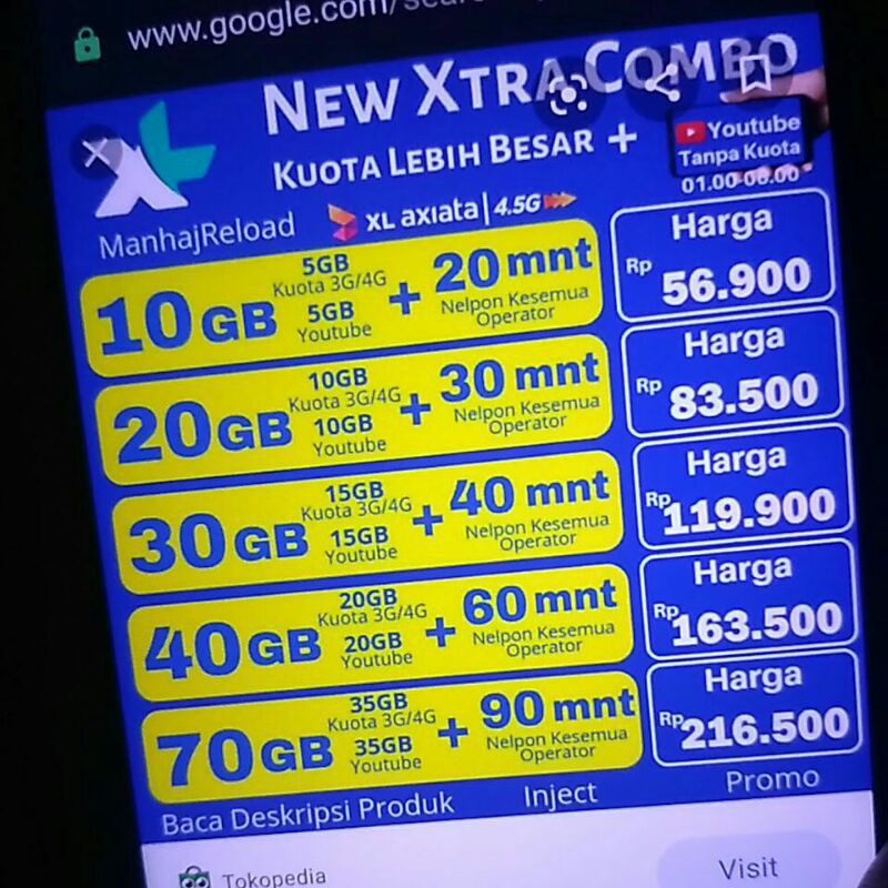 Xl data extra combo 72gb pemakaian perbulan dibagi 2gb dijaringan 3g/4g dan 4gb dijaringan 4g only, bonus telepon 20 menit ke semua operator dan kuota 2gb khusus youtube (bisa dipakai 24jam), masa berlaku kuota 1 tahun (360hari), kuota tidak akumulatif. Tapi beda sama paket data yang harus saat ini emang harus selalu ada. Combo lite 3gb+2gb 4g+1gb ytb 30hrcombo lite 3gb+2gb 4g+1gb ytb 30hr. Kartu perdana xl 21gb xtra combo lite hybrid 21 gb data internet 24jam. Perdana internet tri aon 1 gb aktif 1 tahun.